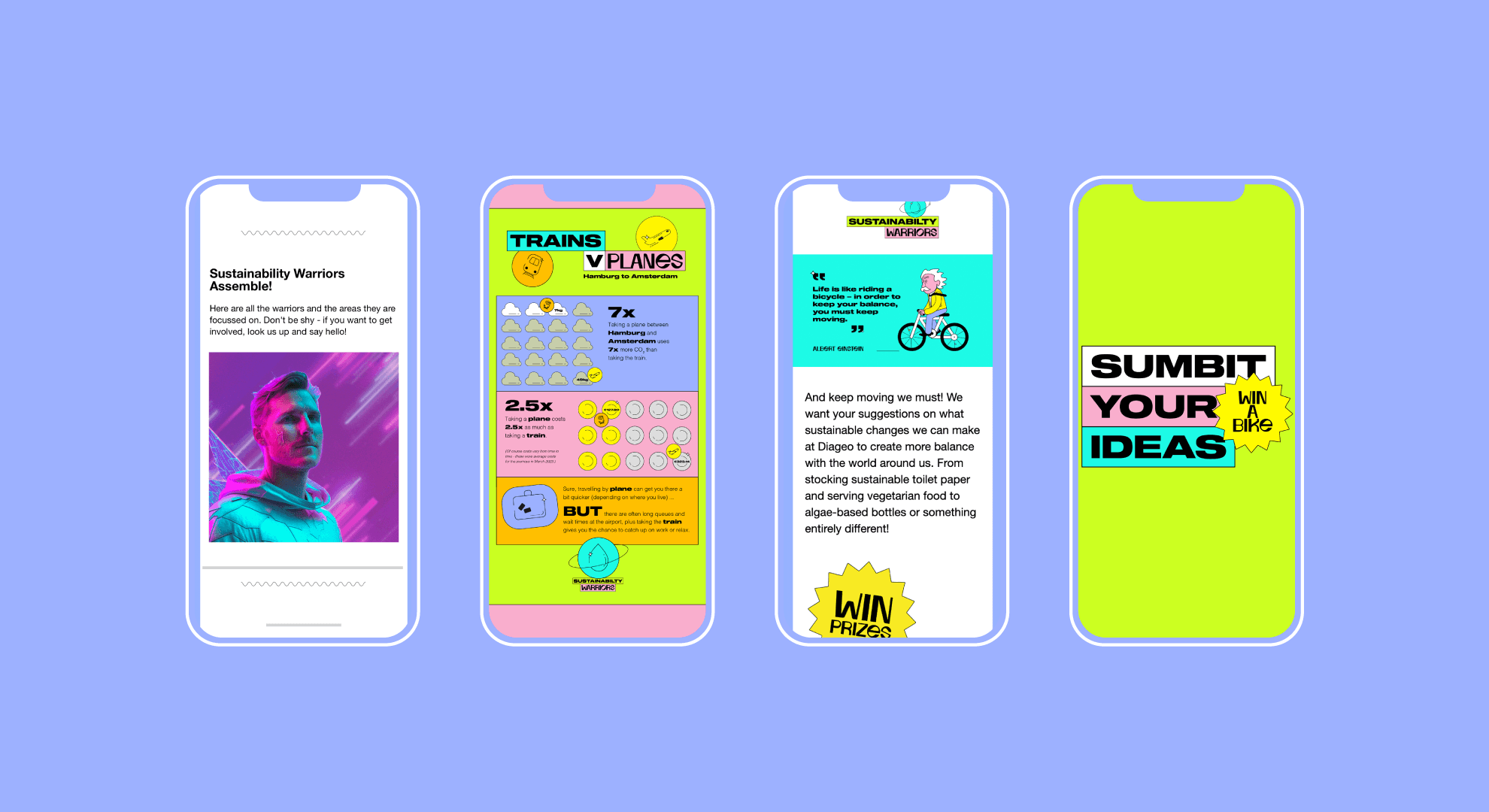 Diageo's internal Sustainability Warriors team needed a vibrant visual identity that would cut through traditional corporate communications and make their sustainability messaging engaging, digestible, and attention-grabbing for employees across Northern Europe.